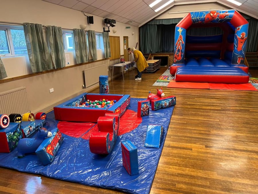 Super Heroes soft play set with ball pond and bouncy castle