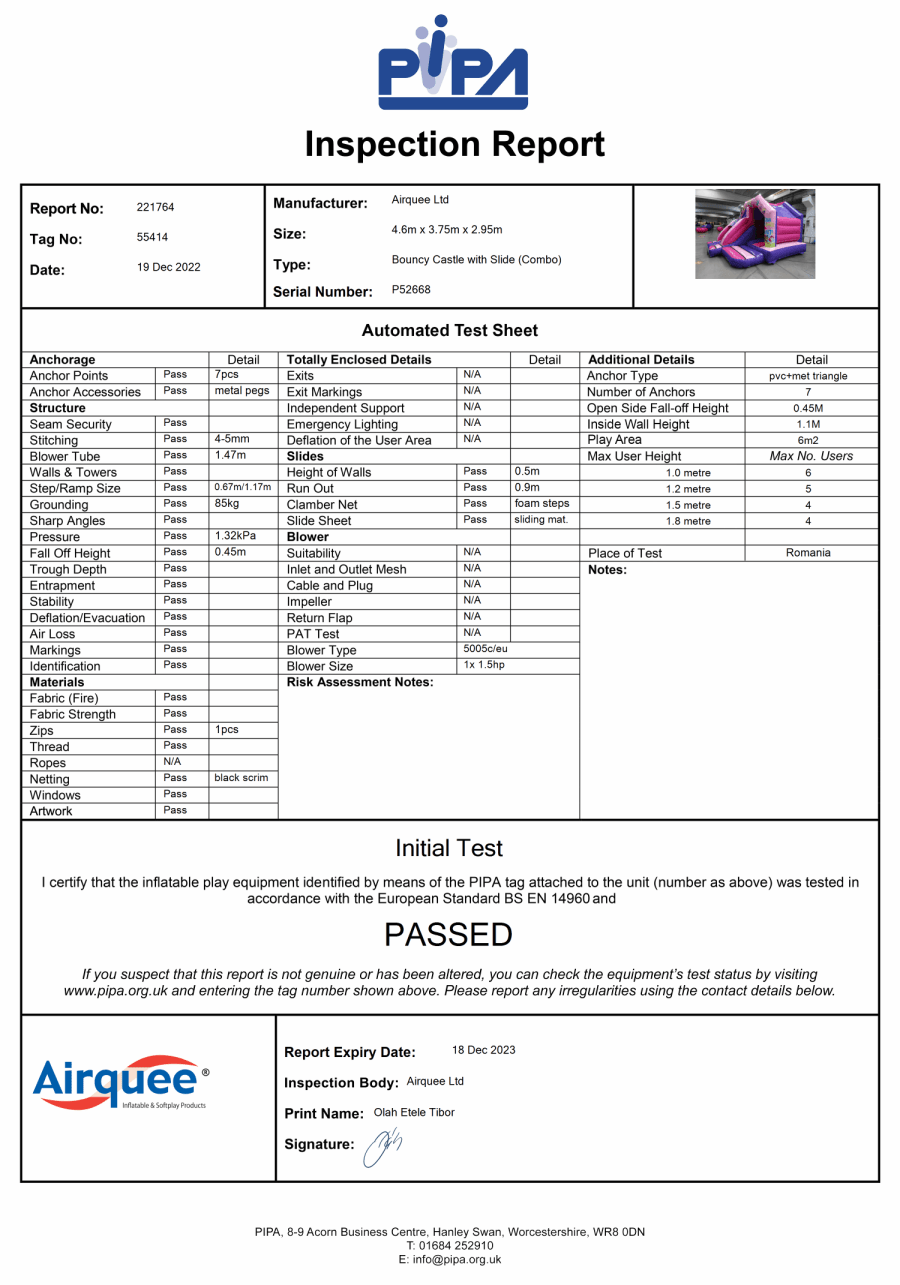 As standard, we provide an electric blower and extension lead. The inflatable will be pegged into grass where appropriate, or weighted with sand bags for indoor or hard-surface setups. One safety mat is supplied free of charge.