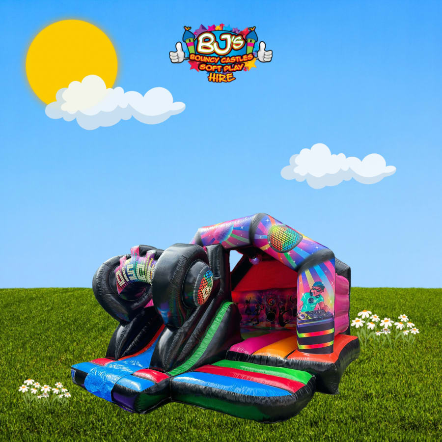 Introducing the Disco Club 3D front slide + PA speaker + disco light bouncy castle for hire