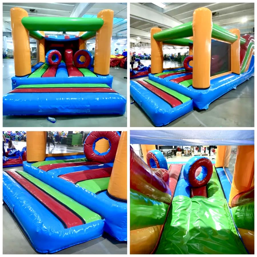 With a size of (Clarence) 14ft wide x 25ft long x 9.5ft with low height, this activity obstacle bouncy castle with an internal slide is specifically designed for indoor halls with short ceilings. However, it can also be used outdoors, making it a versatile option for any venue as this superb unit has a rain cover for those days when there are showers.