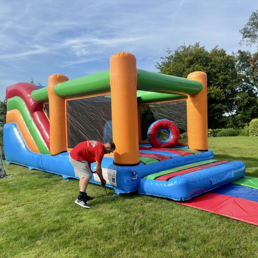 safety mat is supplied free. We provide an electric blower and an extension lead when setting up the equipment, the inflatable will be pegged into the grass as standard or sand bags provided if booked for indoors and one