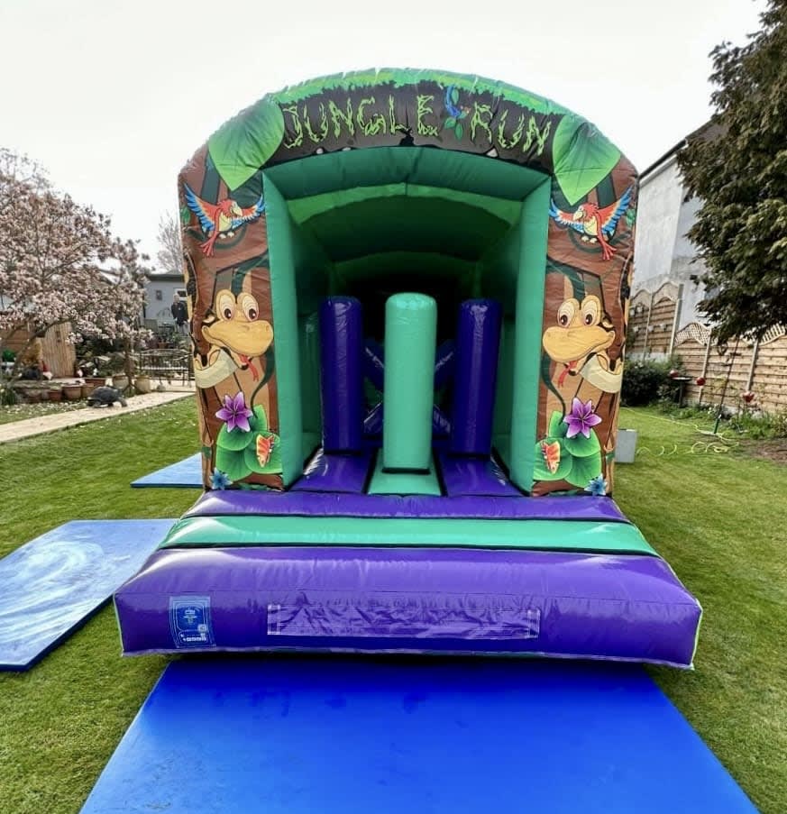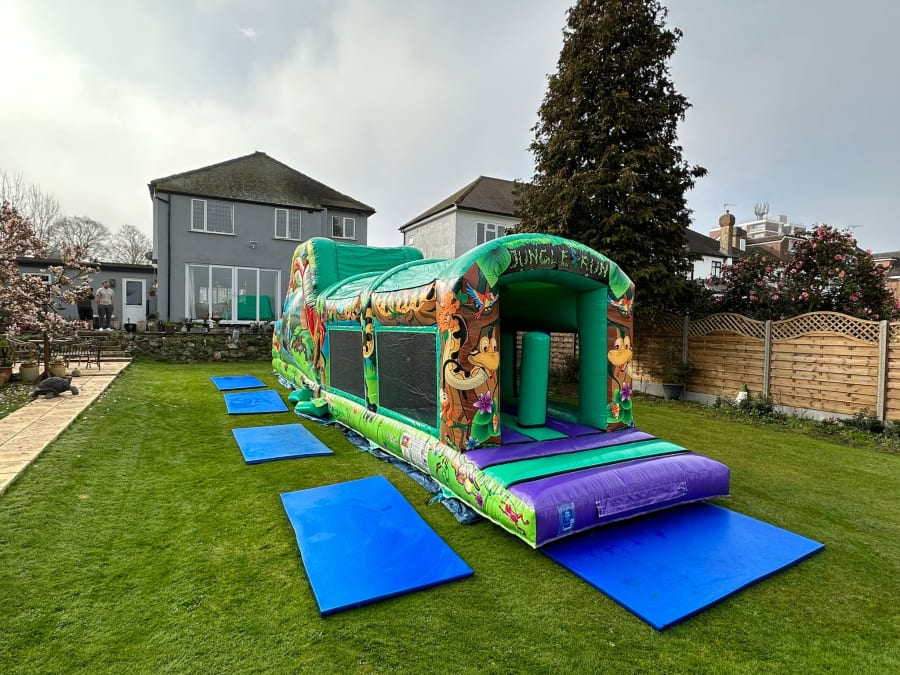 Inside, you will find a sequence of obstacles that keep the energy going from one end to the other. There are sections to dodge, features to squeeze through and a slide at the exit so every run finishes with a quick swoop back to the ground. The deluxe jungle artwork runs throughout, with colourful animals and foliage that look great in photos and add extra excitement for younger guests.