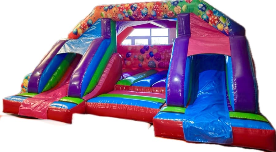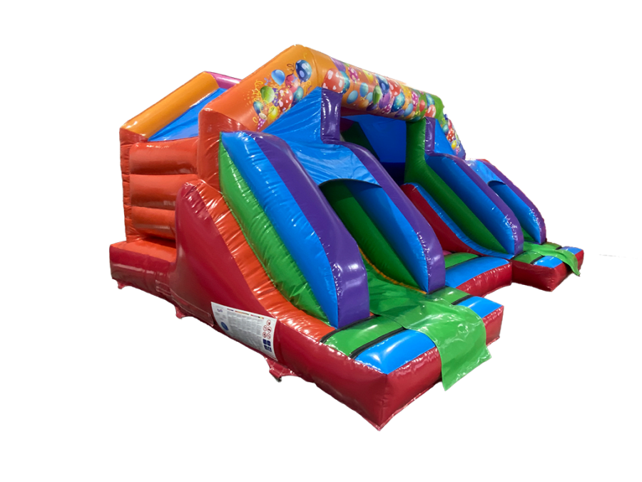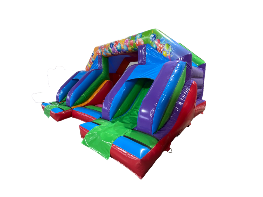 Hire the ultimate new kids’ attraction. Our brand new Double Bounce & Slide Party bouncy castle delivers double the fun with a built-in twin slide and full sun and rain cover for any occasion. As this new inflatable is the same height as standard bouncy castles, it will fit in most halls.
