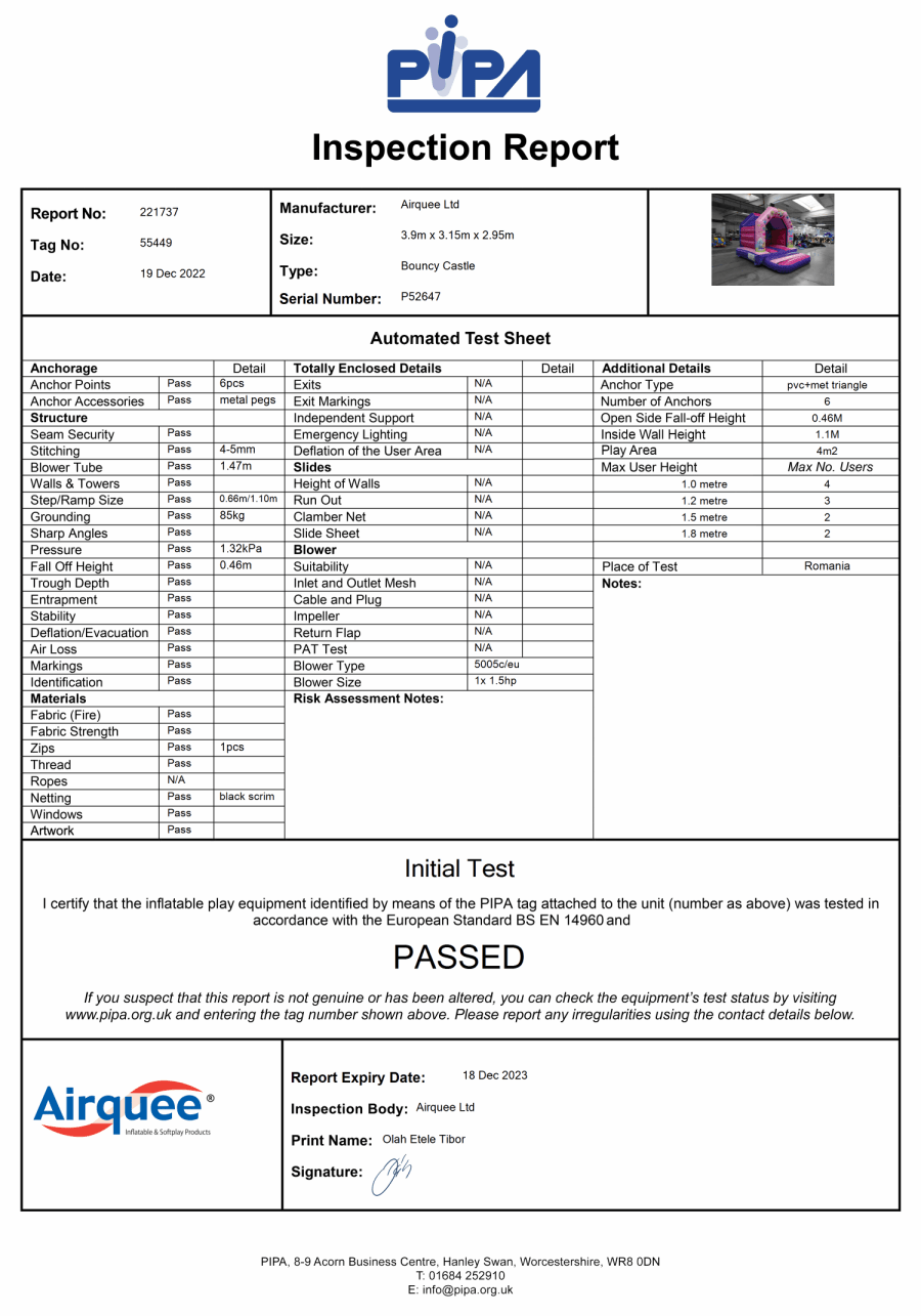 The castle is PIPA tested for safety and supplied with everything needed for correct installation. Every hire includes: