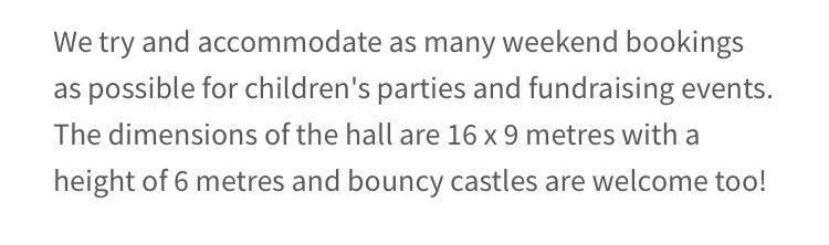 The dimensions of the hall are 16 x 9 metres with a height of 6 metres and bouncy castles are welcome too!