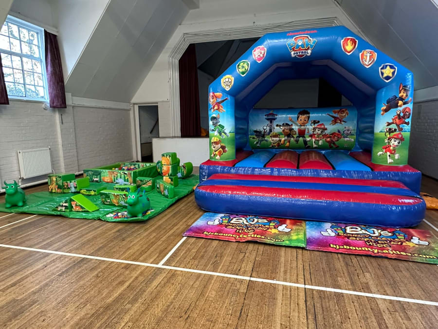 The Main Hall (27ft x 55ft (8.3m x 16.8m)) is a large bright space with wooden sprung flooring marked out for badminton. At one end is a raised stage of 65 sqm, perfect for amateur dramatics, with a manual curtain with stage lighting plugs. At the other end is a store room (adjacent to the kitchen) for chairs which can be used as a bar when empty. This hall is great for all of BJ's Bouncy Castles products that are 14ft high due to ceiling height. Activity castles, pirate ship and soft play packages with super hero themes, princess, unicorns, farm, paw patrol, peppa pig, mickey and friends.
