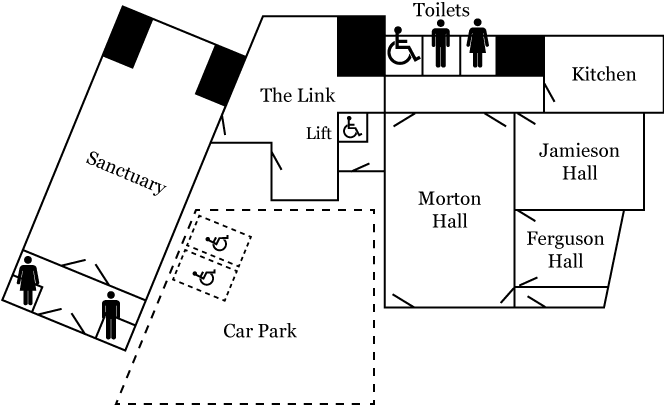 St John’s offers one large hall with tall ceilings, two smaller halls and a well equipped kitchen, all accessible by wheelchair. One of the smaller halls is suitable for showing slides, where there is a pull down screen.