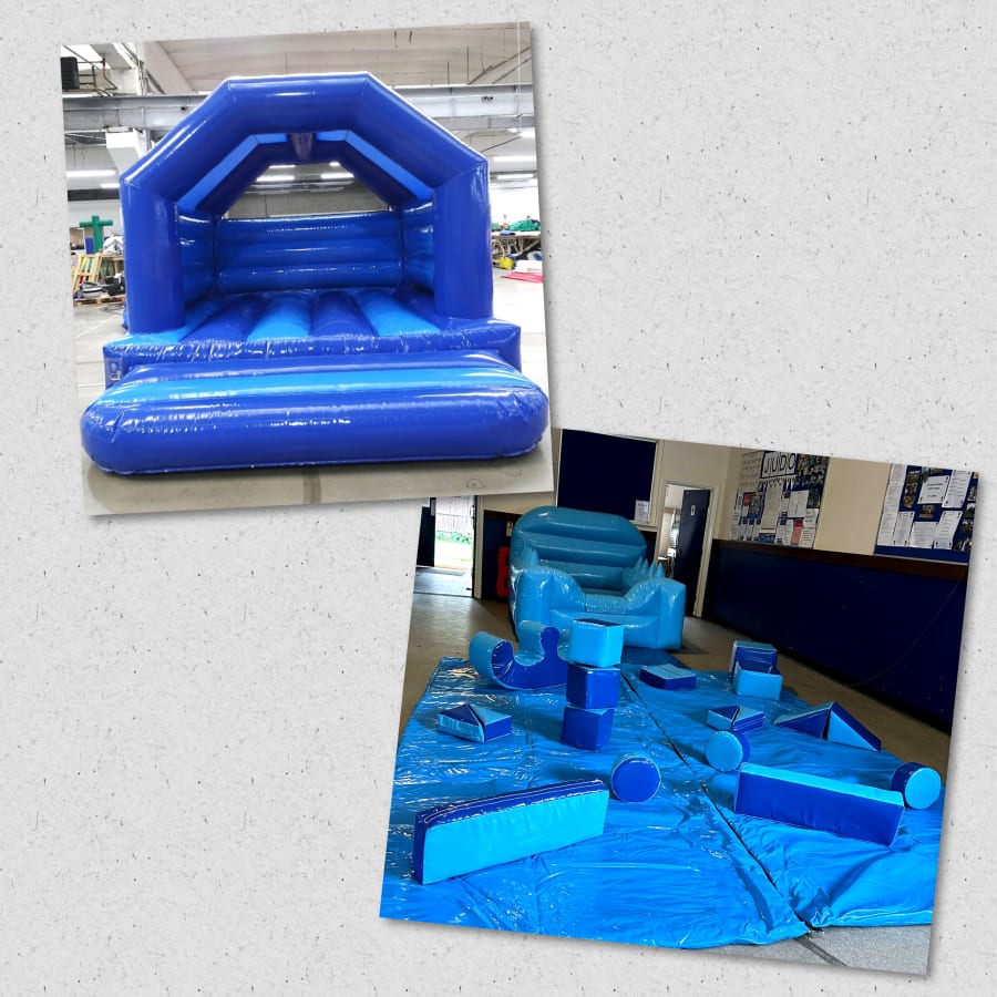 Blue/blue soft play package with a air juggler ball pond & a choice of castle