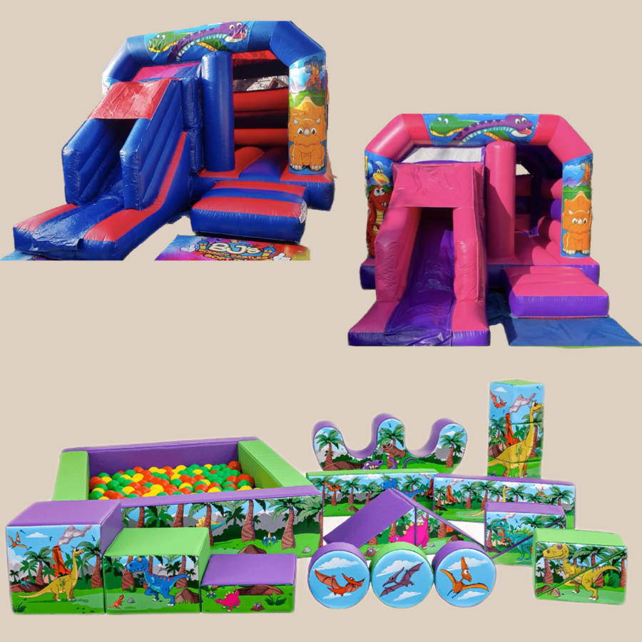 - 1 x Choice of bounce and slide OR tots slide with Dino artwork