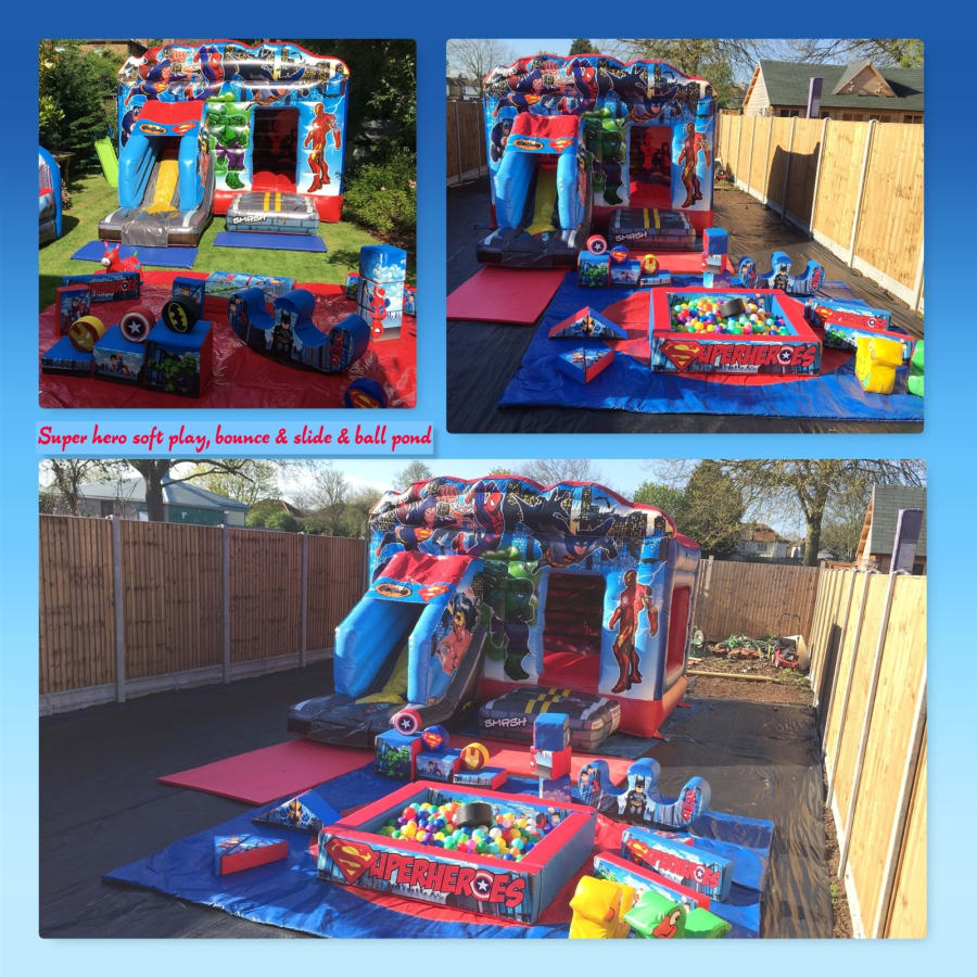 Superheroes soft play set with ball pond and bounce and slide