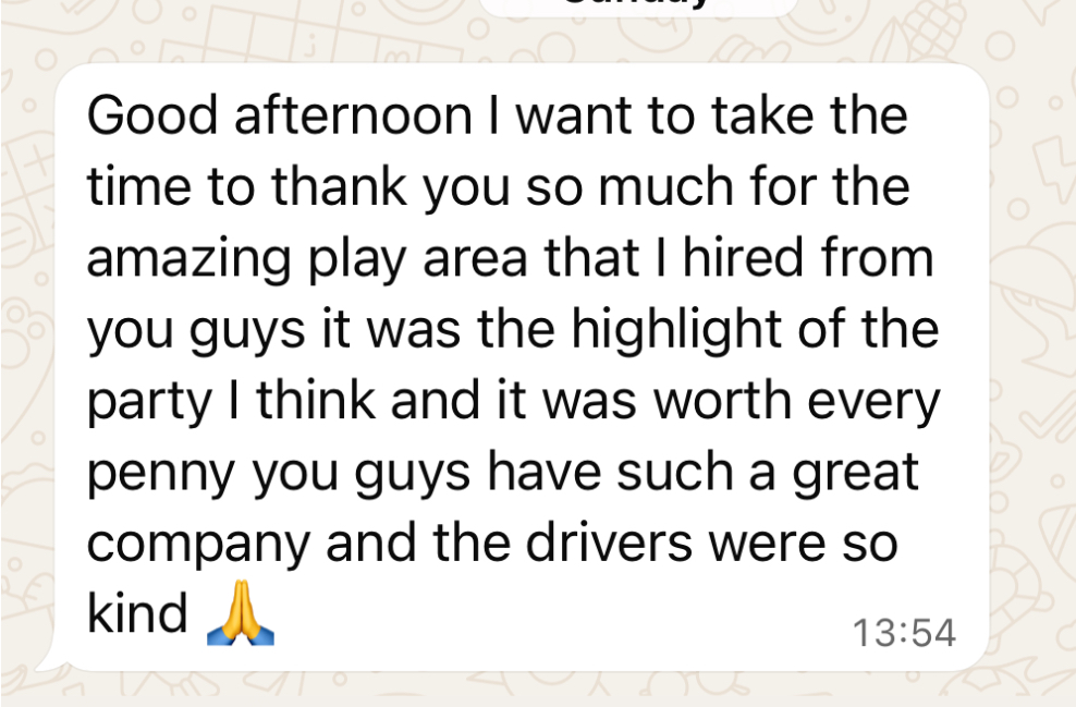 They gave me a call within the allocated slot beforehand, arrived promptly, and set everything up so quickly. The bouncy castle was a huge hit with all the kids, while the soft play was ideal for the under 1s.